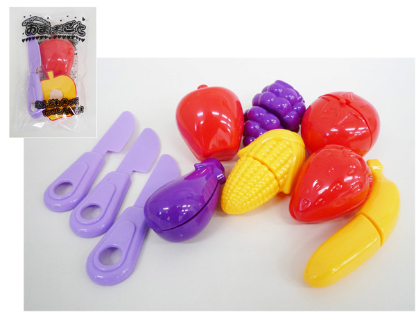 ママのお手伝いできるかな^^?やさい・くだものをプラスチック製の包丁でザクッとカット。