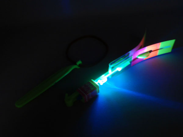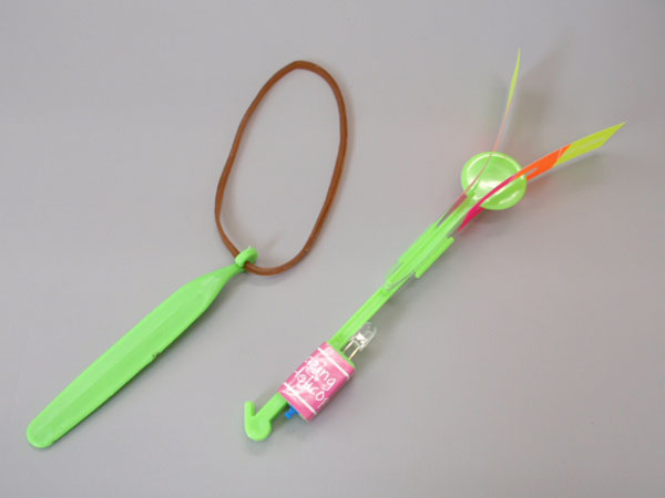 ゴムの力で高く飛びあがり、くるくる回りながら落ちてきます。ブルーLED搭載!スイッチはON/OFFです。