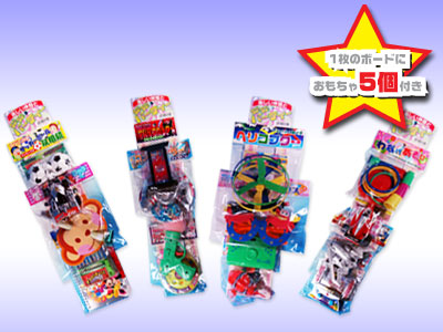 1枚のボードに色々なおもちゃが5個付いたワクワクセット。 たくさんの種類が必要な方にピッタリです。どんなおもちゃが付いてくるかはお楽しみ!